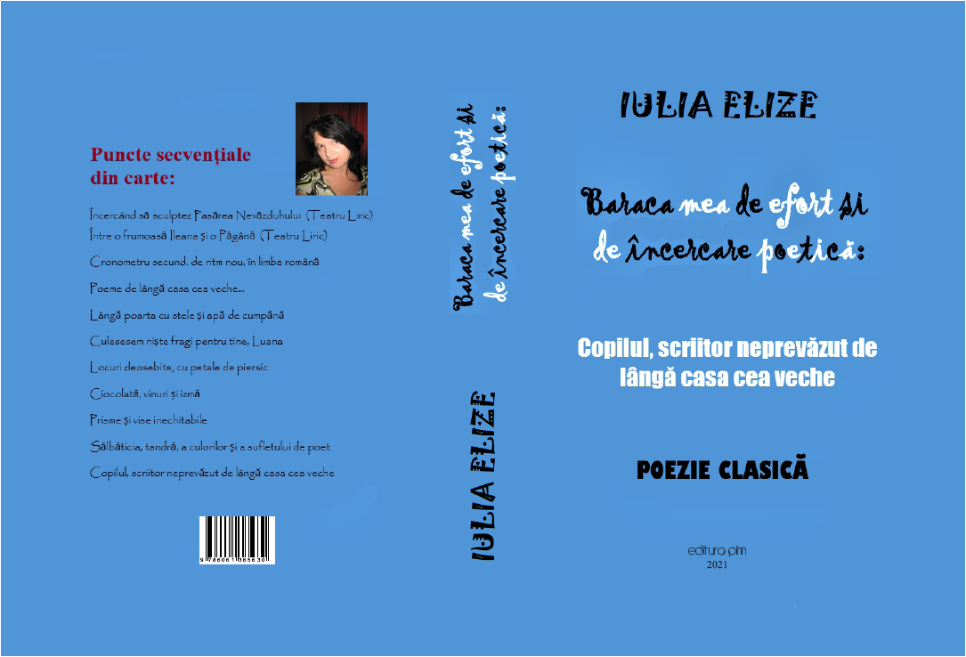 Este, probabil, foarte real, cea mai amplă carte pe care am scris-o însumând aproximativ 638 de pagini de Poezie clasică. Conține și pastel în vers lung, are o secțiune de teatru liric, pentru cei mai pretențioși, și un ritm nou, în limba română, sub patent ”Iulia Elize”. Coperta cu verde este disponibilă internațional (coperta de prezentare pe Lulu.com). Proiect ”LULU.com”, ca exemplu de copertare diferită. (Se poate achiziționa în această variantă, în modulul ”LULU.COM”, ca variantă auxiliară.)